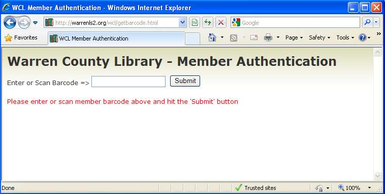Enter or scan the member's barcode and click on the Submit button. Follow the onscreen prompts.